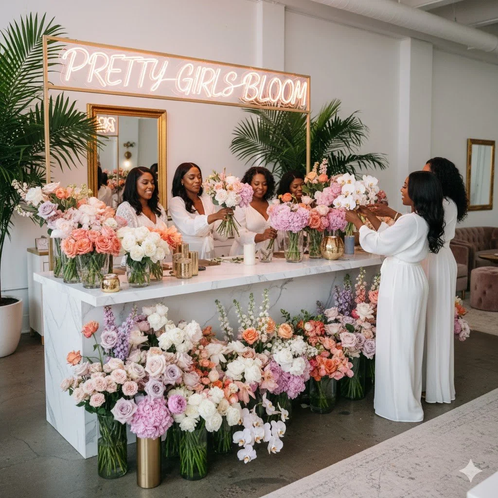 Pretty Girls Bloom is Atlanta’s only mobile flower bar and self‑care experience. It’s where flowers, champagne, tea and intentional moments come together. We create immersive floral experiences that help women slow down, celebrate beautifully, and bloom…on purpose.